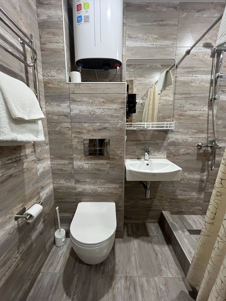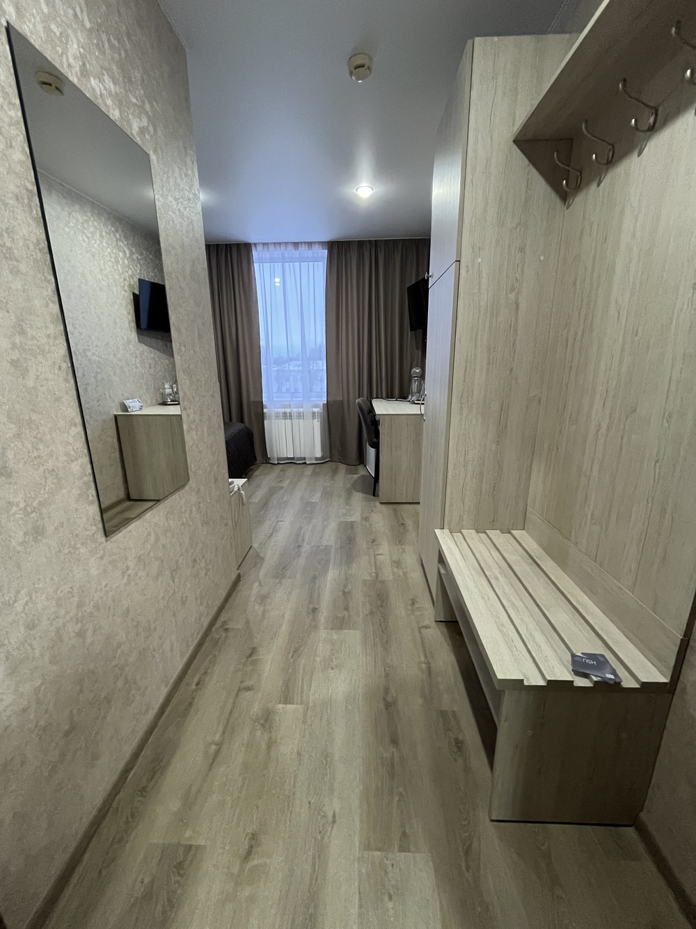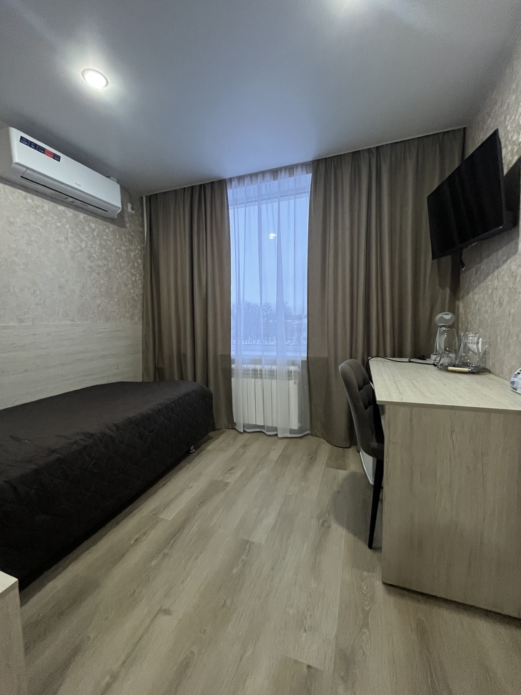 В номере: кровать, стол, стул, тумба, шкаф, кондиционер, телевизор, телефон, холодильник, фен.Санузел с душевой кабиной, водонагреватель