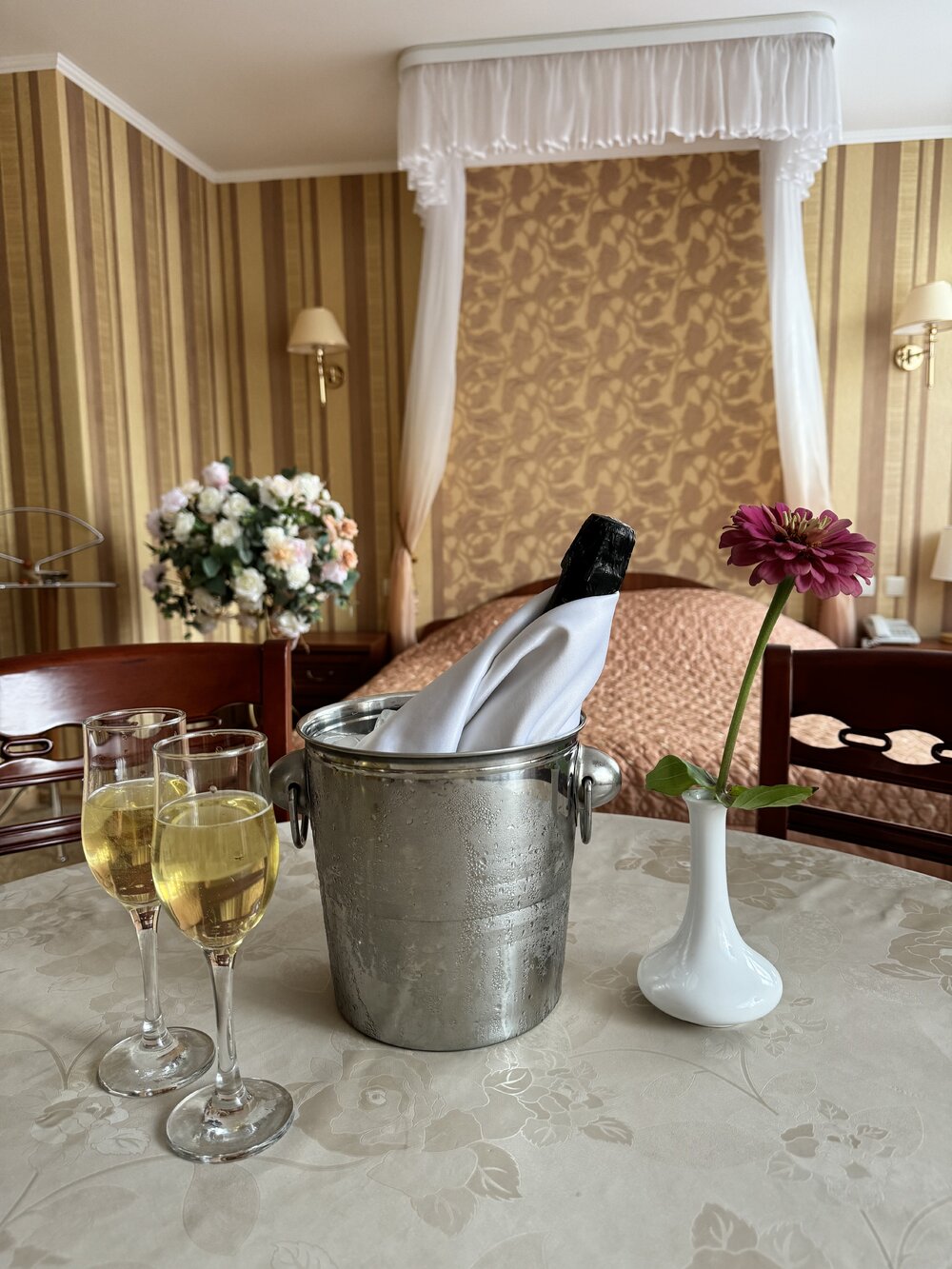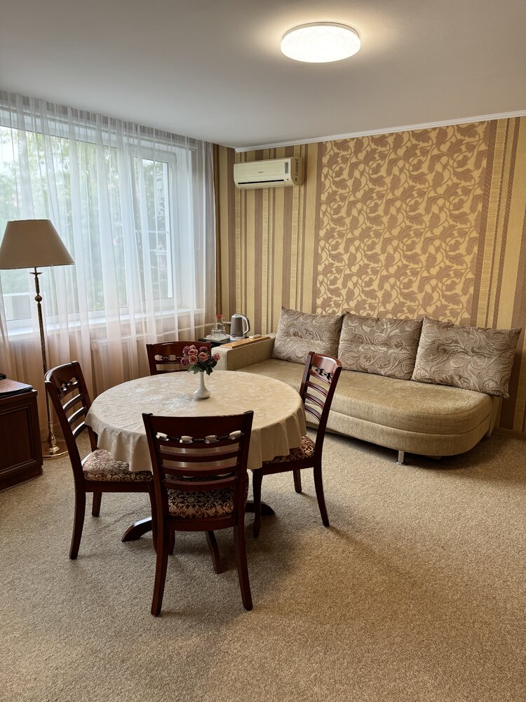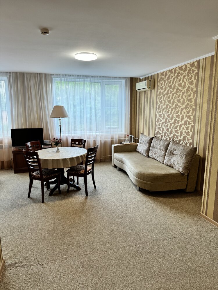 В номере: двуспальная кровать, диван, прикроватные тумбы, туалетный столик, обеденный стол, стулья, шкаф для одежды, прихожая, багажная полка, телевизор, телефон, фен, холодильник, кондиционер.
