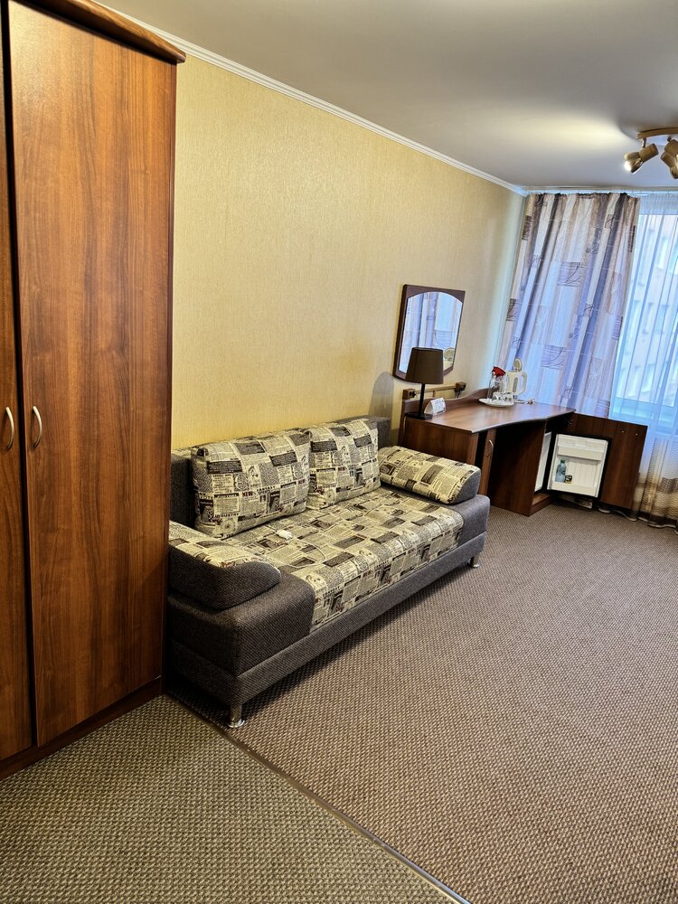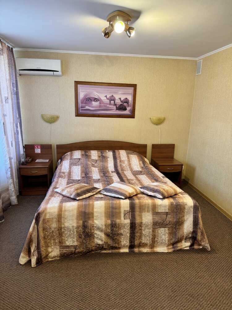 В номере: двуспальная кровать, диван, прикроватные тумбы, туалетный столик, обеденный стол, стулья, шкаф для одежды, прихожая, багажная полка, телевизор, телефон, фен, холодильник, кондиционер.