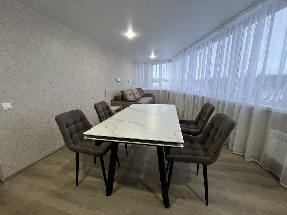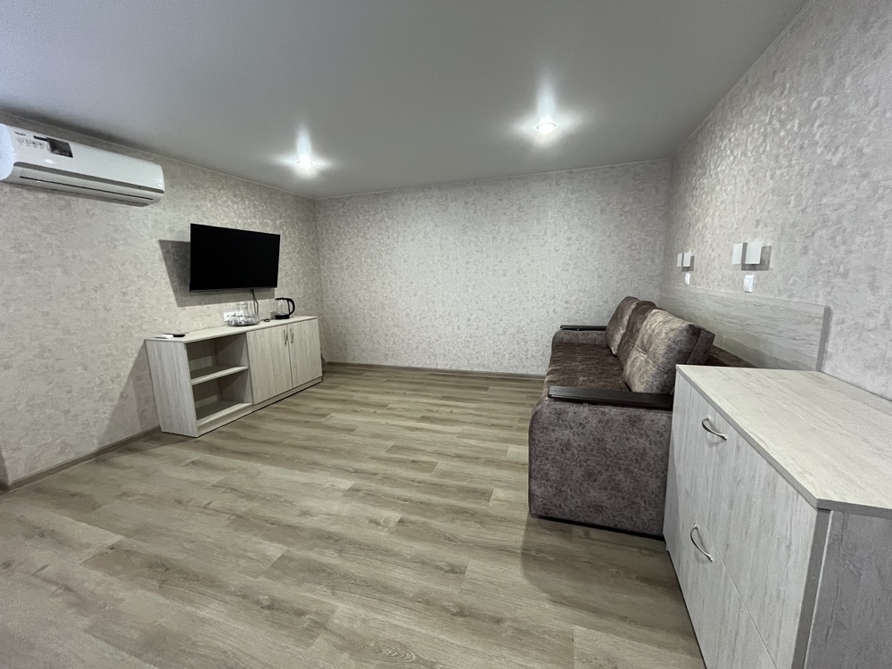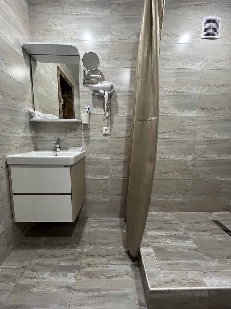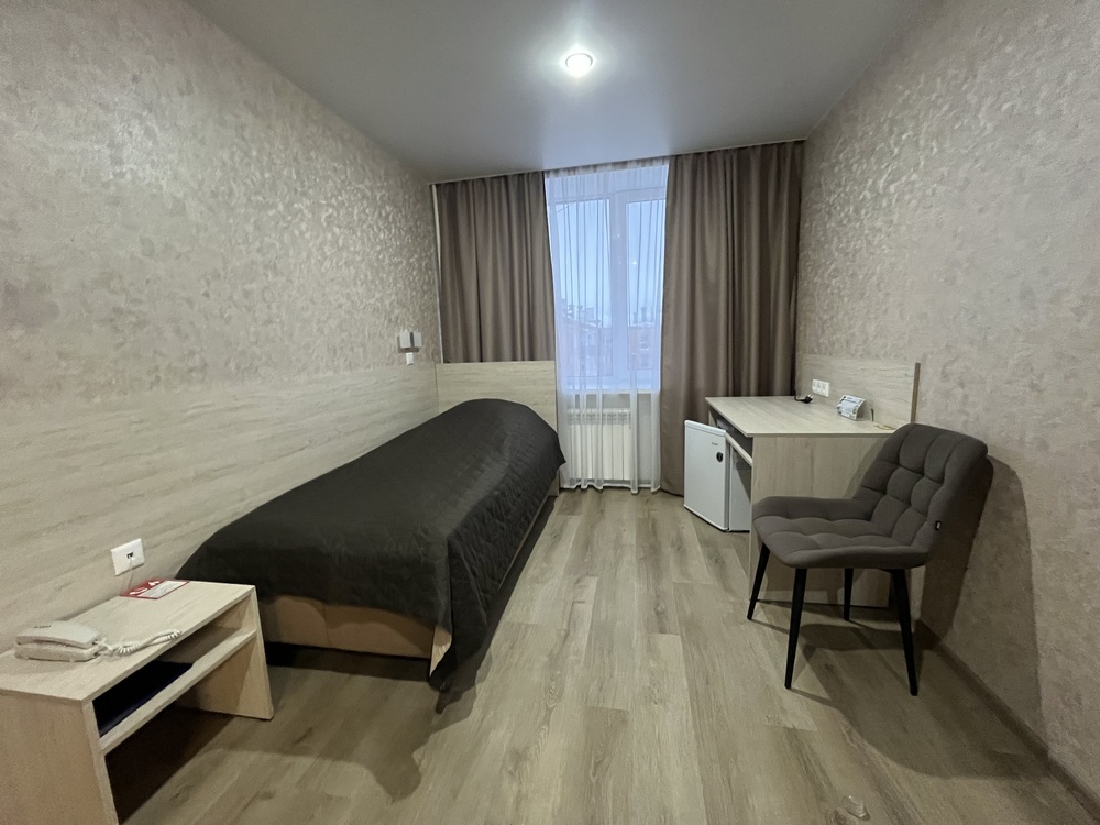 В номере: двуспальная кровать, односпальная кровать, диван-кровать (как доп. место), прикроватные тумбы, туалетный столик, обеденный стол, стулья, шкаф для одежды, прихожая, багажная полка, телевизор, телефон, фен, холодильник, кондиционер.
