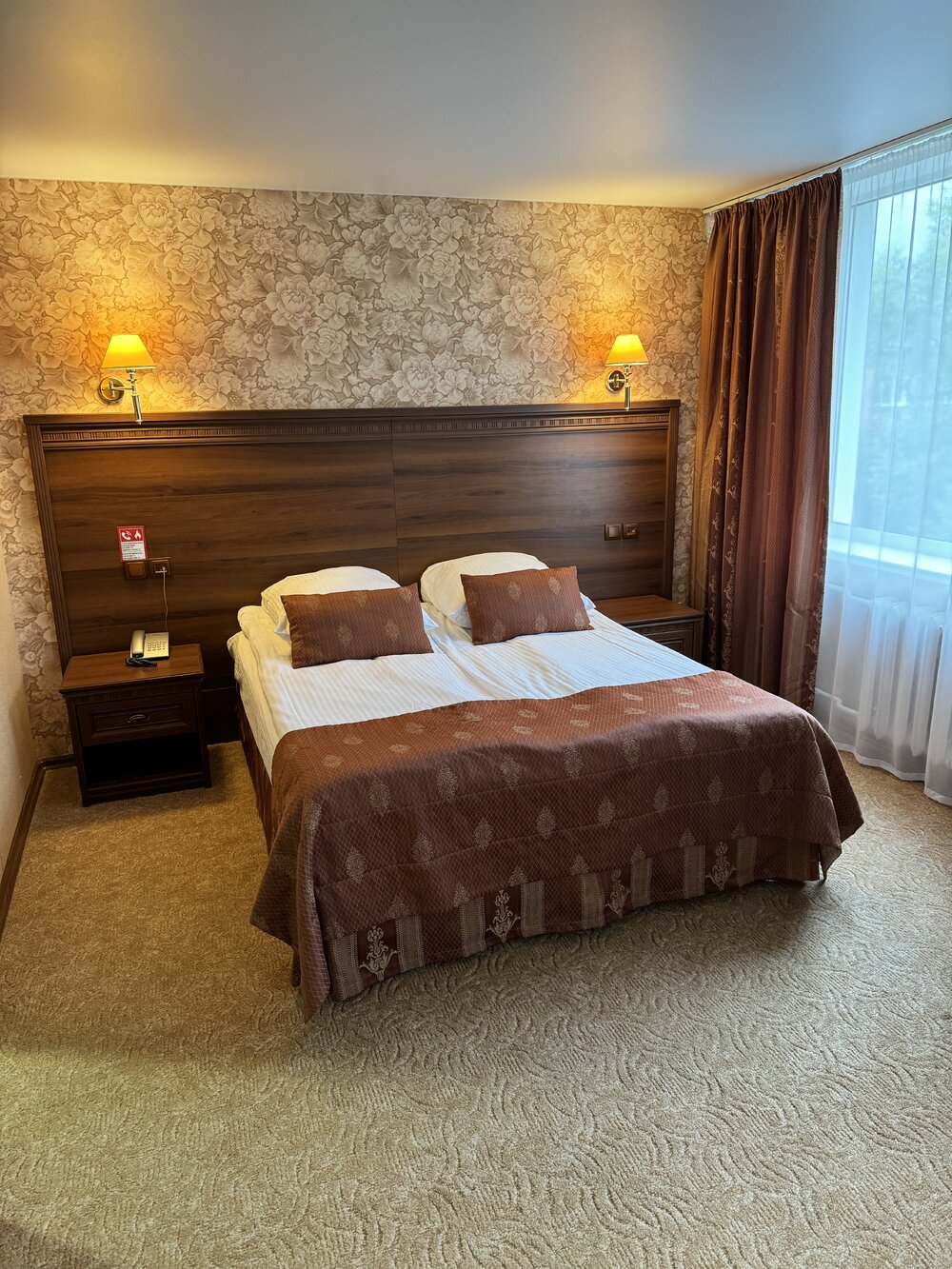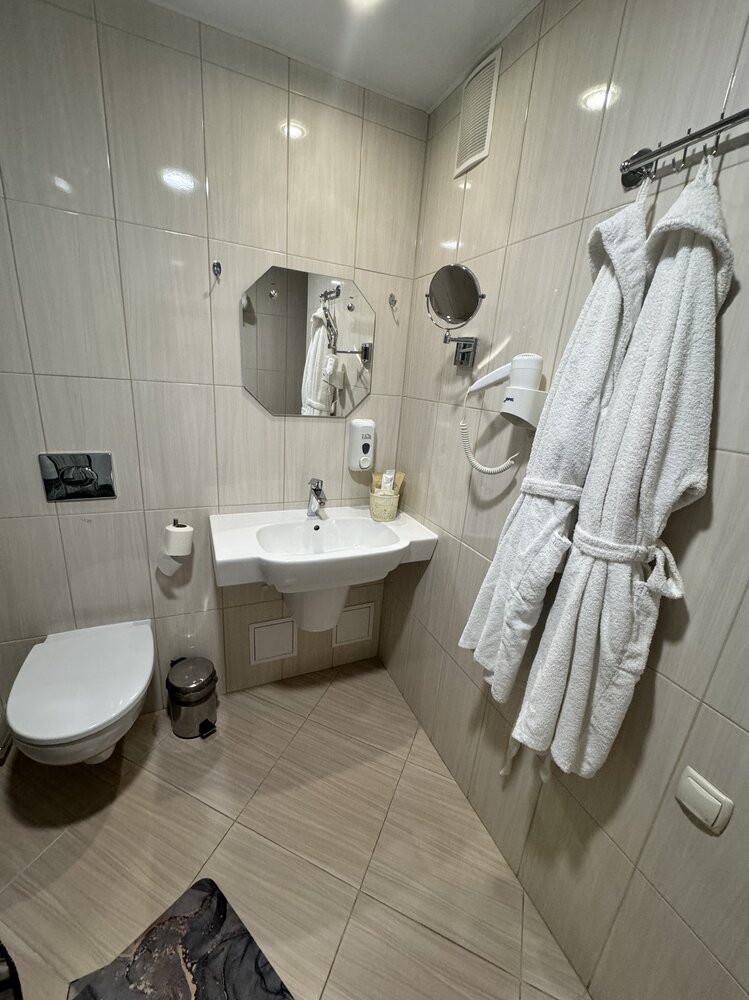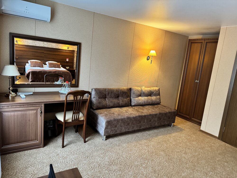 В номере: двуспальная кровать, диван, прикроватные тумбы, пуф, обеденный стол, стулья, шкаф для одежды, прихожая, багажная полка, телевизор, телефон, фен, холодильник, кондиционер.