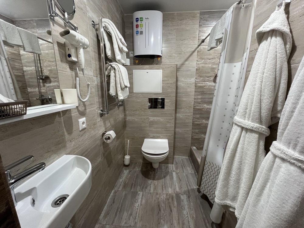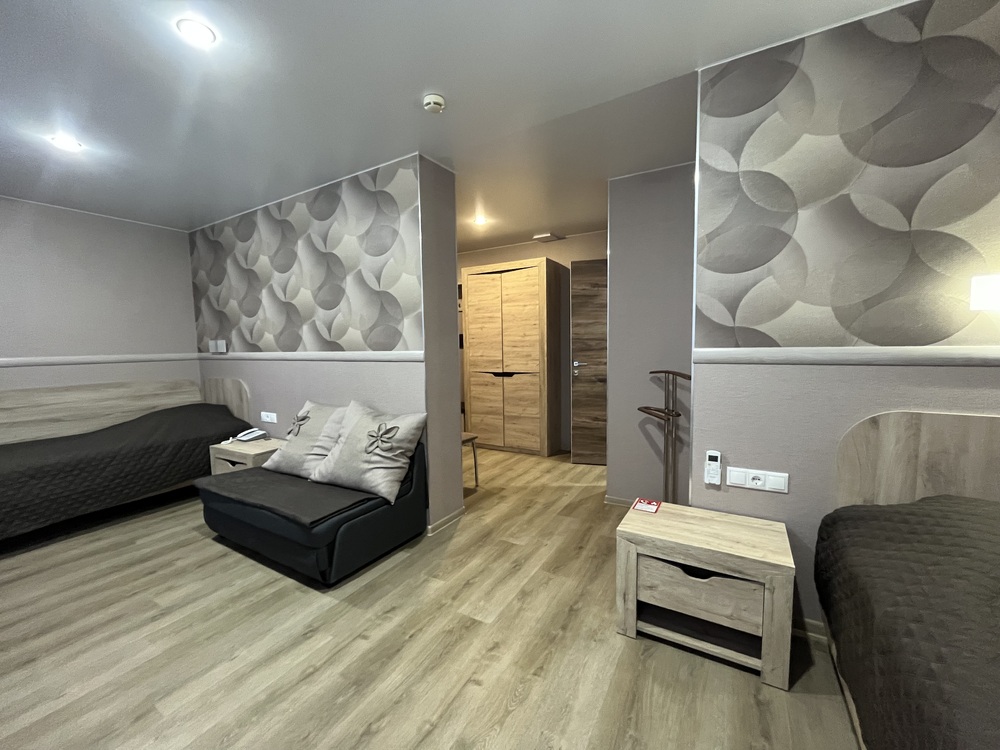В номере: две односпальные кровати, диван, прикроватные тумбы, обеденный стол, стулья, шкаф для одежды, прихожая, багажная полка, кухонный уголок, телевизор, телефон, фен, холодильник, кондиционер.