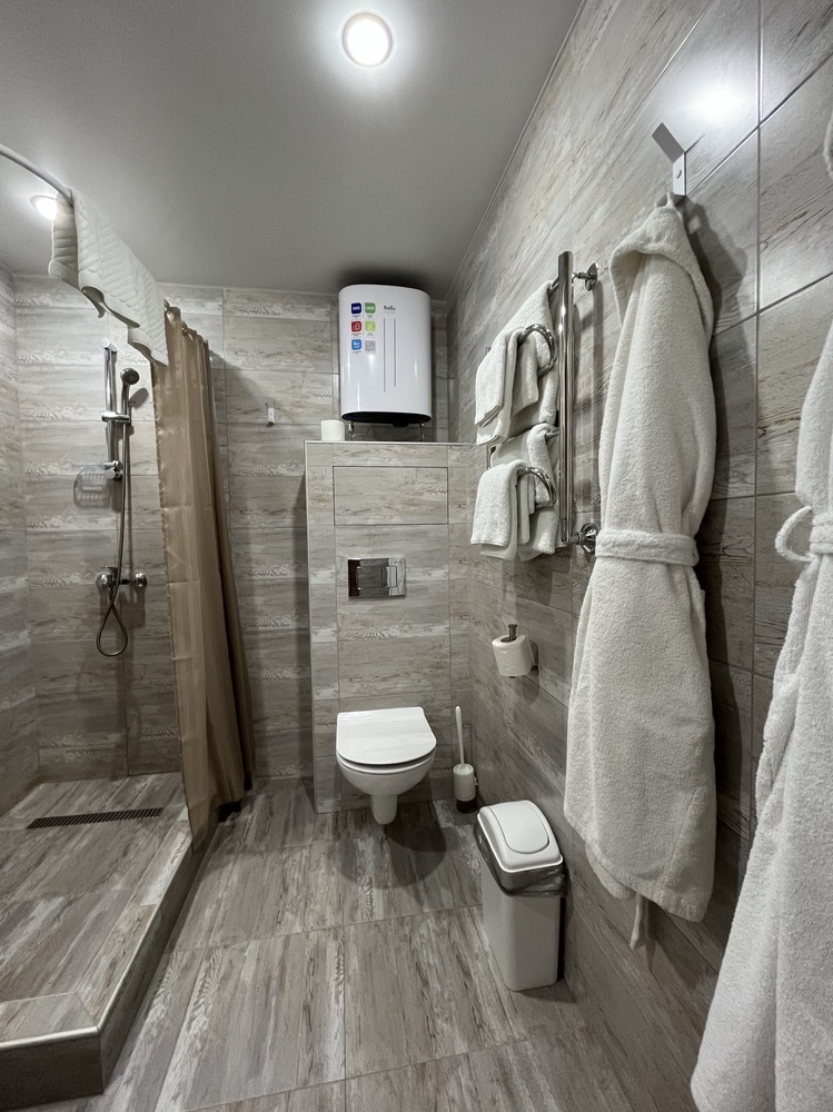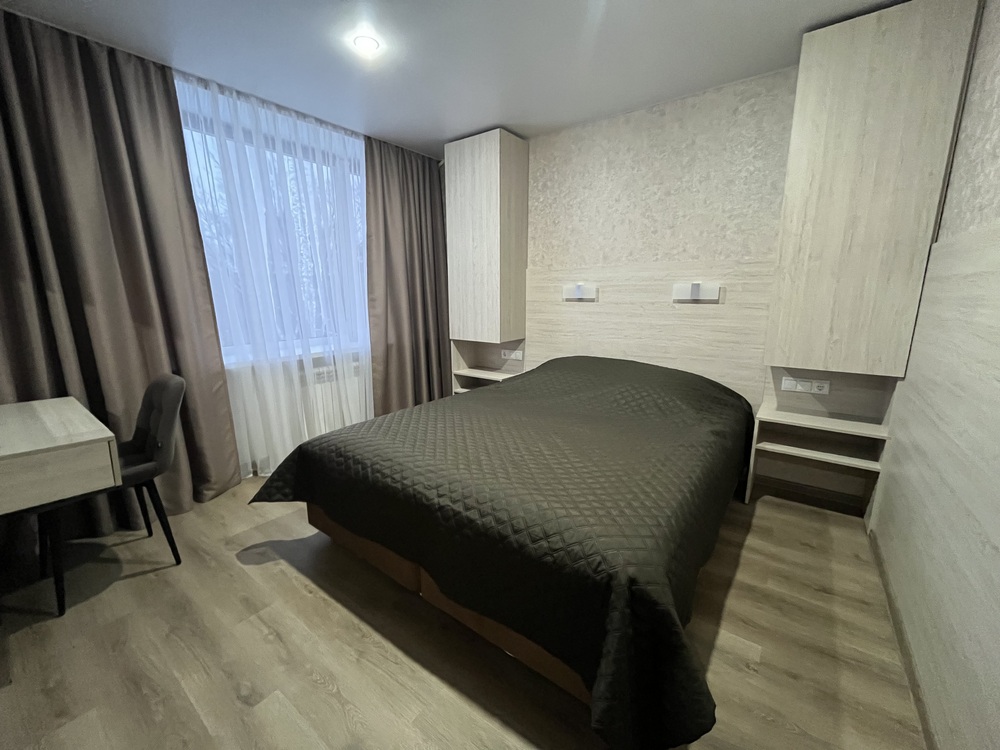 В номере: двуспальная кровать, односпальная кровать, диван-кровать (как доп. место), прикроватные тумбы, туалетный столик, обеденный стол, стулья, шкаф для одежды, прихожая, багажная полка, телевизор, телефон, фен, холодильник, кондиционер.