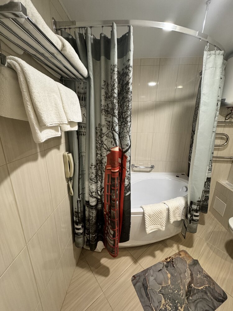 В номере: двуспальная кровать, диван, прикроватные тумбы, пуф, обеденный стол, стулья, шкаф для одежды, прихожая, багажная полка, телевизор, телефон, фен, холодильник, кондиционер.