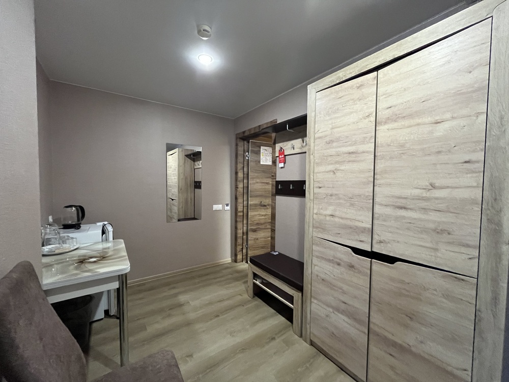 В номере: две односпальные кровати, диван, прикроватные тумбы, обеденный стол, стулья, шкаф для одежды, прихожая, багажная полка, кухонный уголок, телевизор, телефон, фен, холодильник, кондиционер.